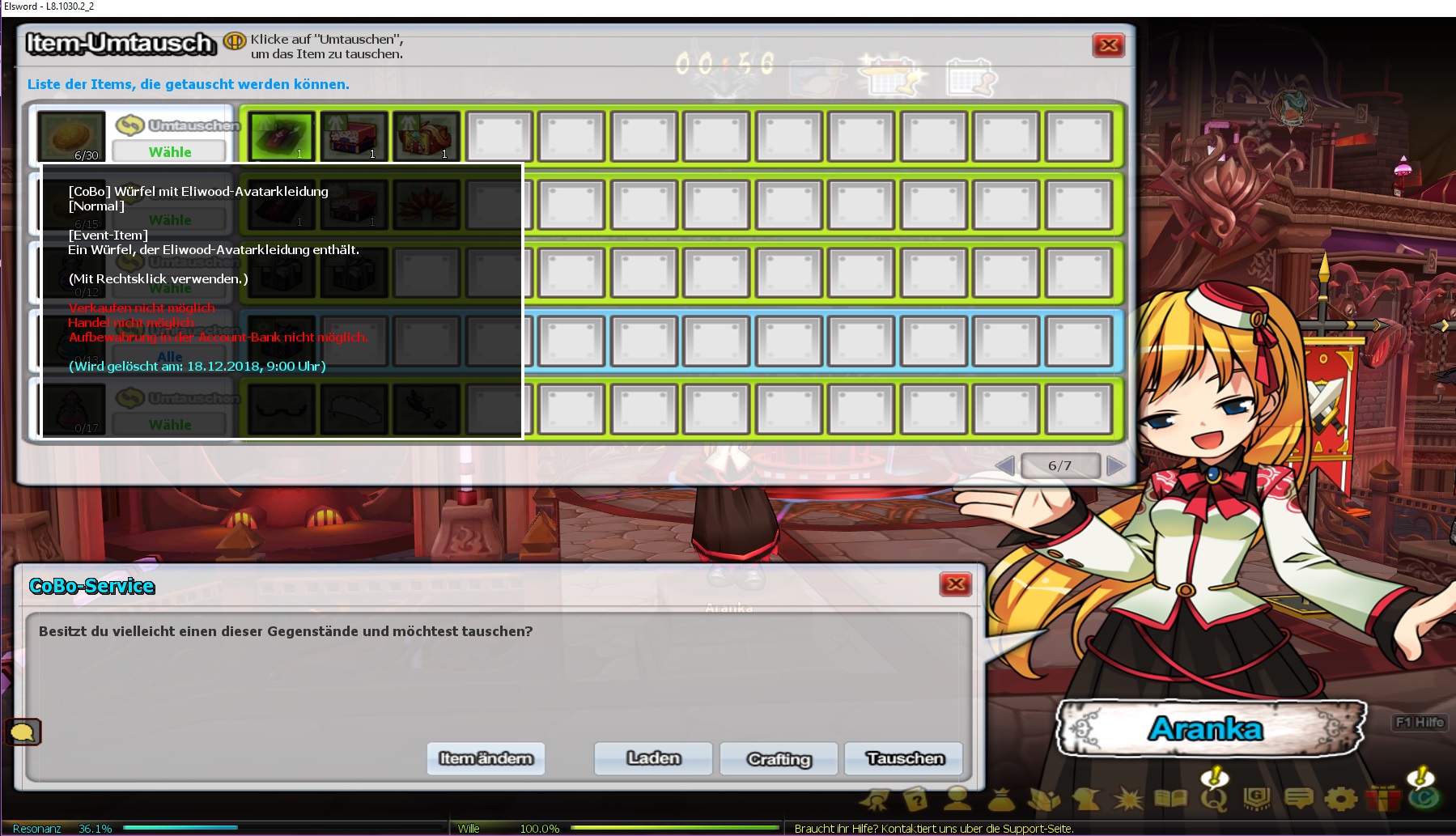 Auf der offiziellen Webseiten von Elsword EU findet man bei den Patch Notes zum aktuellem Event, "Elios-Weltreise 2", unten, bei der Liste an Sachen, die man sich eintauchen kann, hinter dem Item "[CoBo] Würfel mit Eliwood-Avatar" die Bemerkung: (1 Tag).