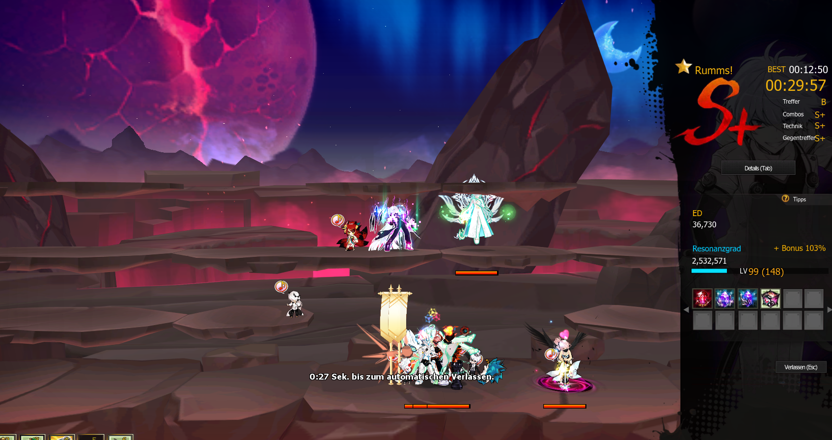 Mit dem Rest meines upgradematerials konnte ich meine rüstung auf +10 und meine handschuhe auf +11 machen und mir einen blauen All Skill Damage 5*Verstärkzngswert ertauschen.